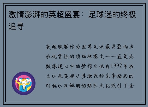 英超足球:世界足球的巅峰盛宴 英超联赛,作为全球最具影响力、观赏性和商业价值的职业足球联赛之一,无疑是一场场精彩绝伦的足球盛宴。每一个赛季都吸引着来自全球的亿万球迷,成为无数人心中的“精神家园”。究竟是什么让英超如此迷人?让我们从比赛的激情、俱乐部的底蕴以及顶级球星的精彩表现入手,细细品味这个足球世...